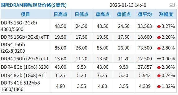 21财经1月13日电,据集邦数据,今日国际DRAM颗粒现货价格整体上涨,DDR5部分颗粒涨幅有所回温,具体来看,DDR5 16G (2Gx8) 4800/5600今日上涨3.27%,均价33.563美元;DDR4方面今日DDR4 8Gb (512Mx16) 2666涨幅相对明显,为3.62%,均价17.167美元。