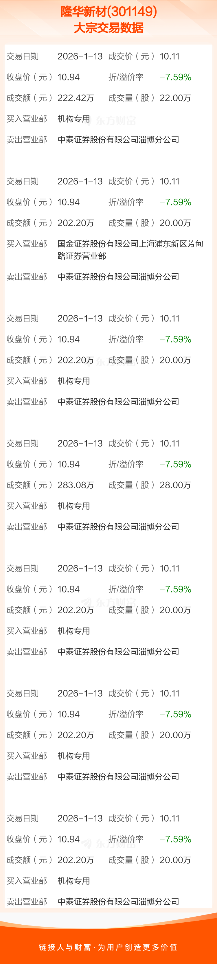 2026年1月13日,隆华新材发生7笔大宗交易,共成交150.00万股,成交金额1516.50万元,占其流通市值比例为0.53%。