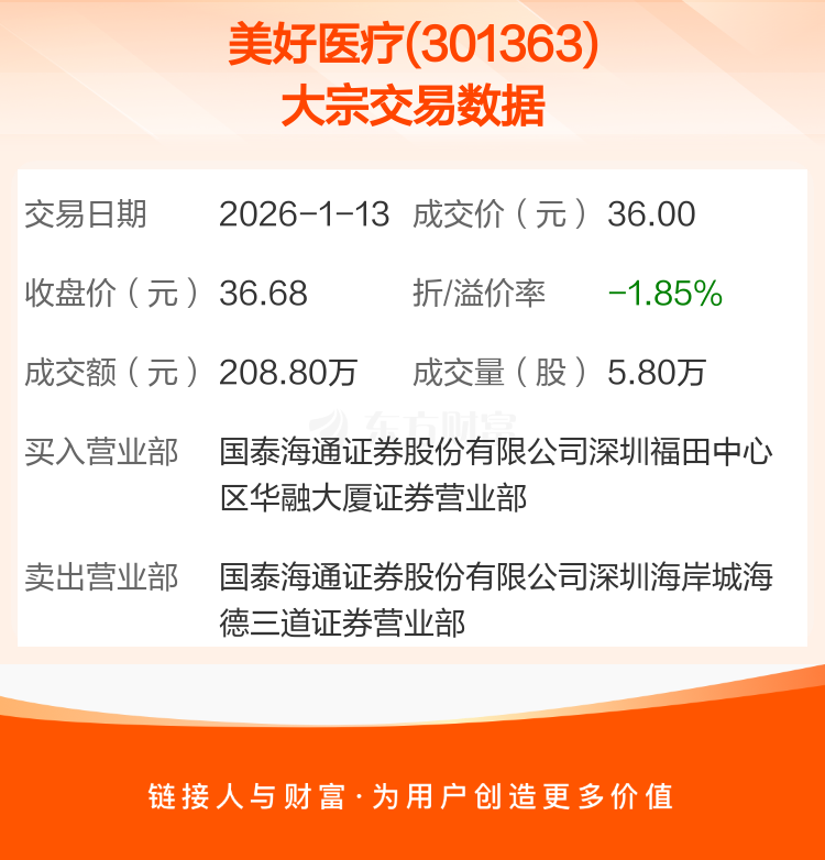 2026年1月13日,美好医疗发生1笔大宗交易,共成交5.80万股,成交金额208.80万元,占其流通市值比例为0.02%。
