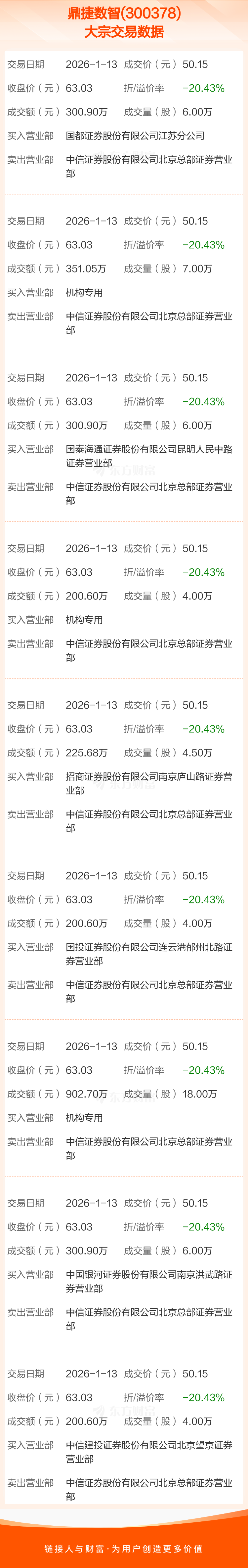 2026年1月13日,鼎捷数智发生9笔大宗交易,共成交59.50万股,成交金额2983.93万元,占其流通市值比例为0.18%。