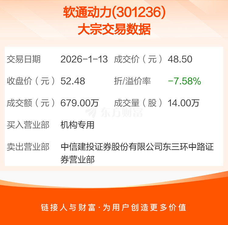 2026年1月13日,软通动力发生1笔大宗交易,共成交14.00万股,成交金额679.00万元,占其流通市值比例为0.02%。