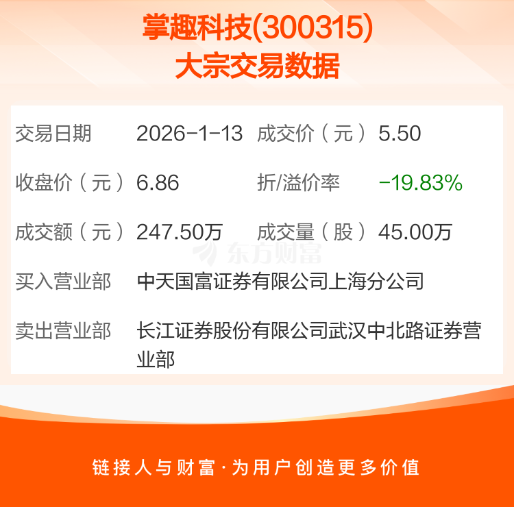 2026年1月13日,掌趣科技发生1笔大宗交易,共成交45.00万股,成交金额247.50万元,占其流通市值比例为0.01%。