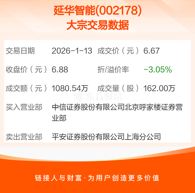 2026年1月13日,延华智能发生1笔大宗交易,共成交162.00万股,成交金额1080.54万元,占其流通市值比例为0.22%。