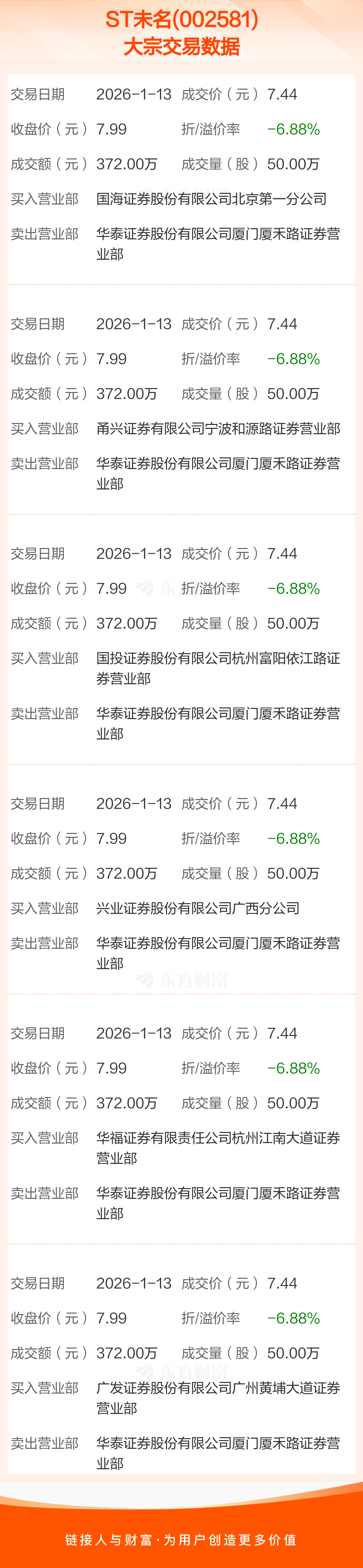 2026年1月13日,ST未名发生6笔大宗交易,共成交300.00万股,成交金额2232.00万元,占其流通市值比例为0.70%。