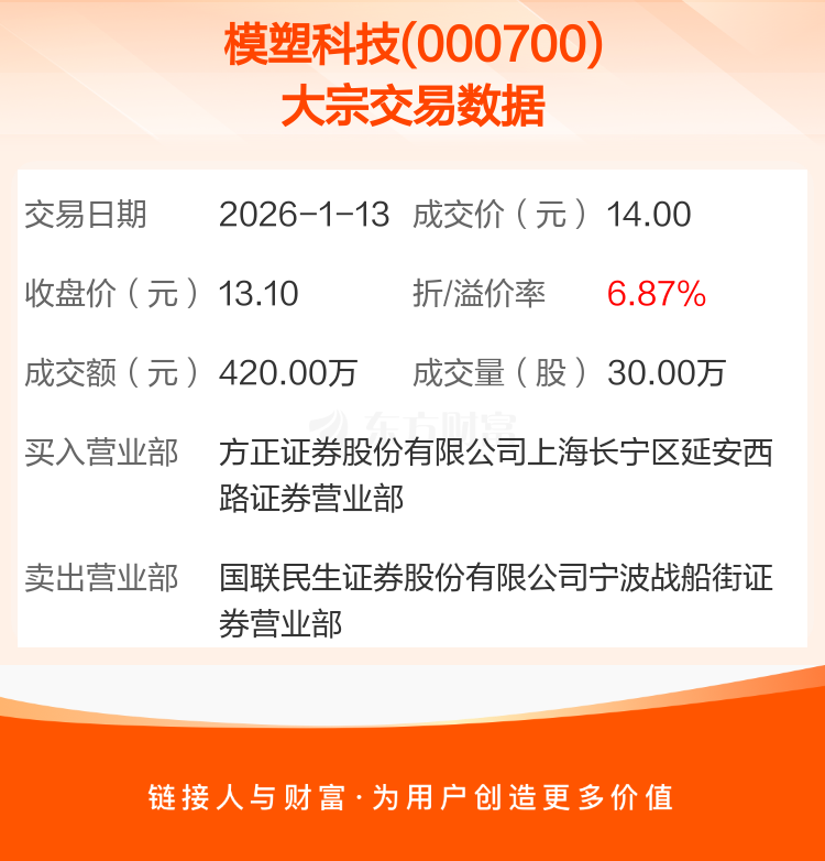 大宗交易:模塑科技成交420.00万元,溢价6.87%(1-13)