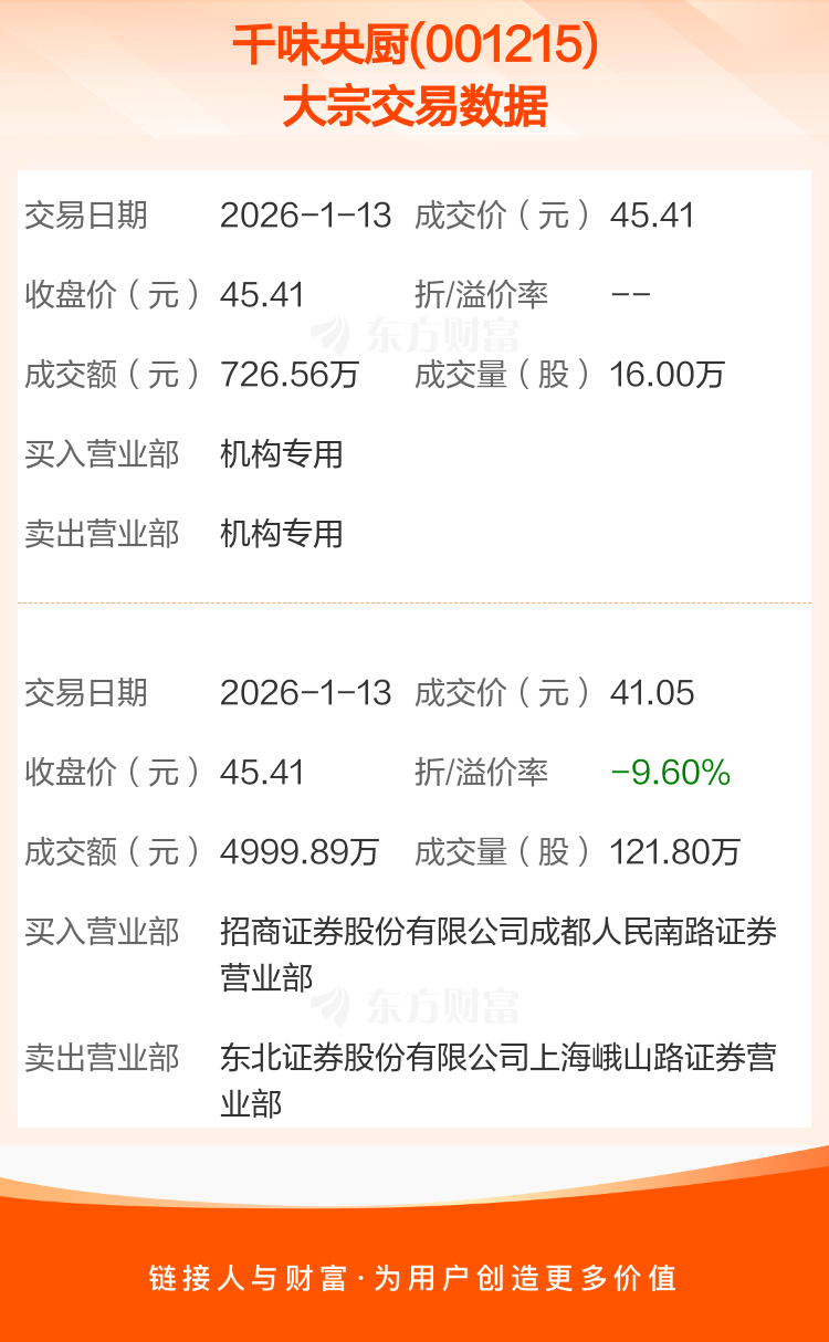 2026年1月13日,千味央厨发生2笔大宗交易,共成交137.80万股,成交金额5726.45万元,占其流通市值比例为1.30%。