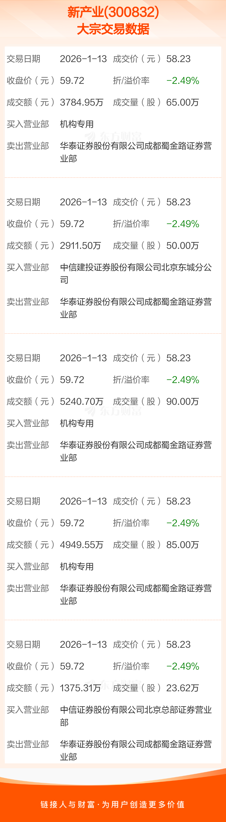 2026年1月13日,新产业发生5笔大宗交易,共成交313.62万股,成交金额1.83亿元,占其流通市值比例为0.45%。