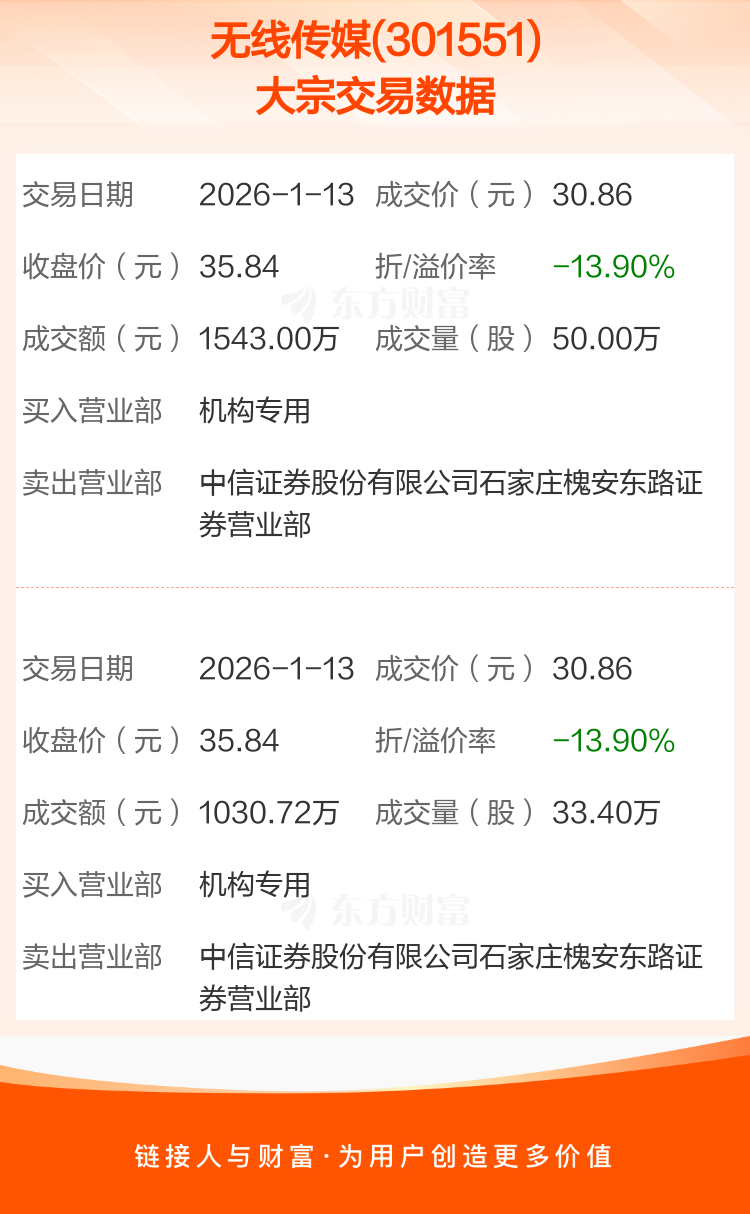 2026年1月13日,无线传媒发生2笔大宗交易,共成交83.40万股,成交金额2573.72万元,占其流通市值比例为0.46%。