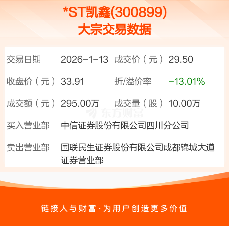 2026年1月13日,*ST凯鑫发生1笔大宗交易,共成交10.00万股,成交金额295.00万元,占其流通市值比例为0.21%。