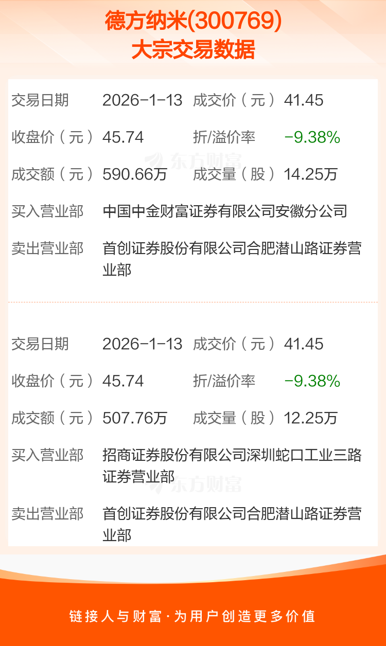 2026年1月13日,德方纳米发生2笔大宗交易,共成交26.50万股,成交金额1098.42万元,占其流通市值比例为0.10%。
