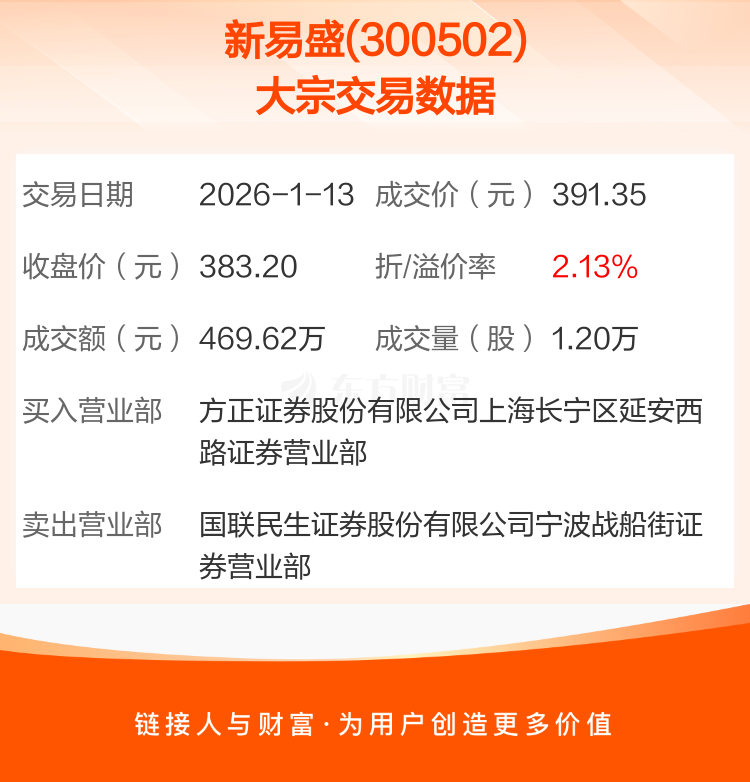 2026年1月13日,新易盛发生1笔大宗交易,共成交1.20万股,成交金额469.62万元。