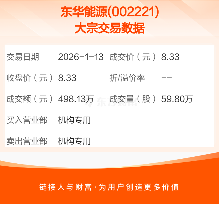 2026年1月13日,东华能源发生1笔大宗交易,共成交59.80万股,成交金额498.13万元,占其流通市值比例为0.04%。