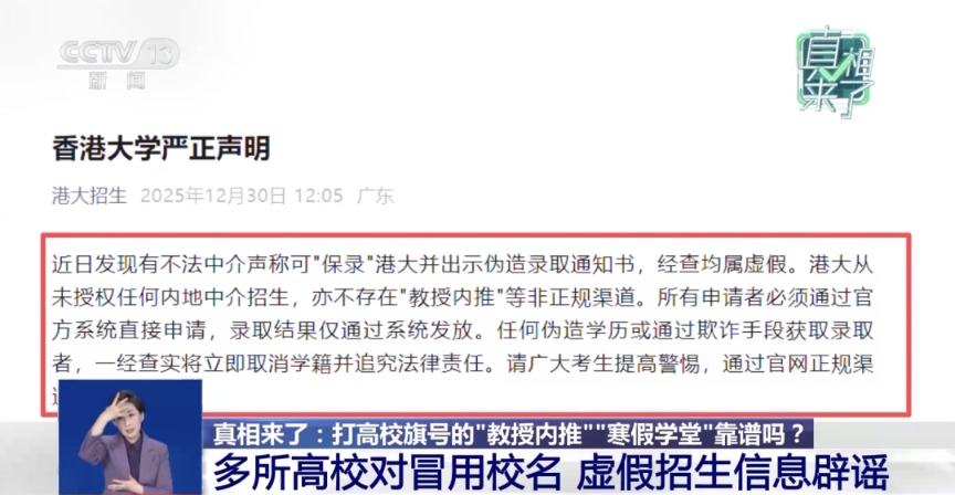 香港大学通过“港大招生”公众号就不法中介声称可“保录”港大并出示伪造录取通知书发布声明称,港大从未授权任何内地中介招生,亦不存在“教授内推”等非正规渠道,提醒广大考生提高警惕。