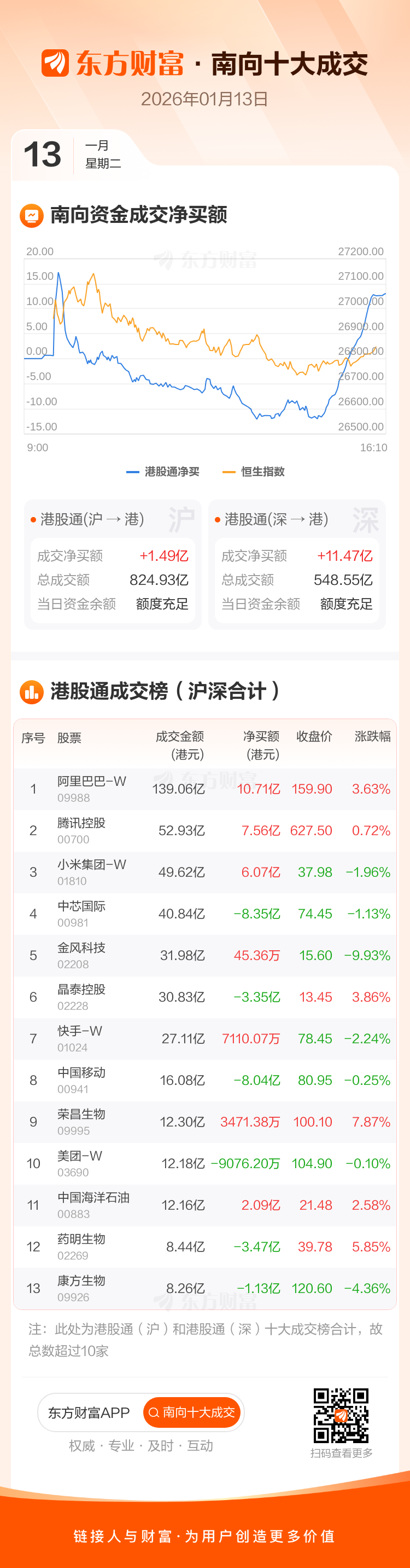 恒生指数1月13日涨0.9%,收报26848.47点。南向资金今日净买入港股12.96亿港元。南向资金今日成交额1373.48亿港元,港股大市成交3151.92亿港元。