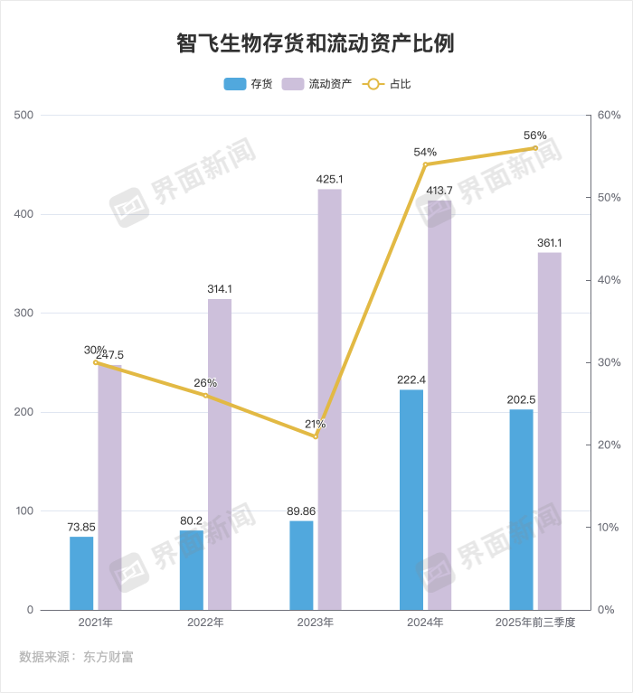 到了2025年前三季度,相关问题仍没有得到明显改善。2025年,智飞生物存货202.5亿元,占流动资产比重56%,同比仅减少了2.16%。