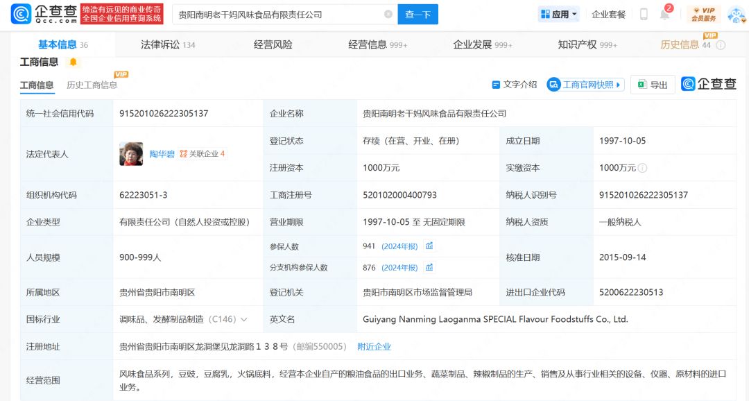 企查查APP显示,老干妈关联公司贵阳南明老干妈风味食品有限责任公司成立于1997年10月,法定代表人为老干妈创始人陶华碧,注册资本1000万元,由陶华碧之子李妙行、李贵山共同持股。
