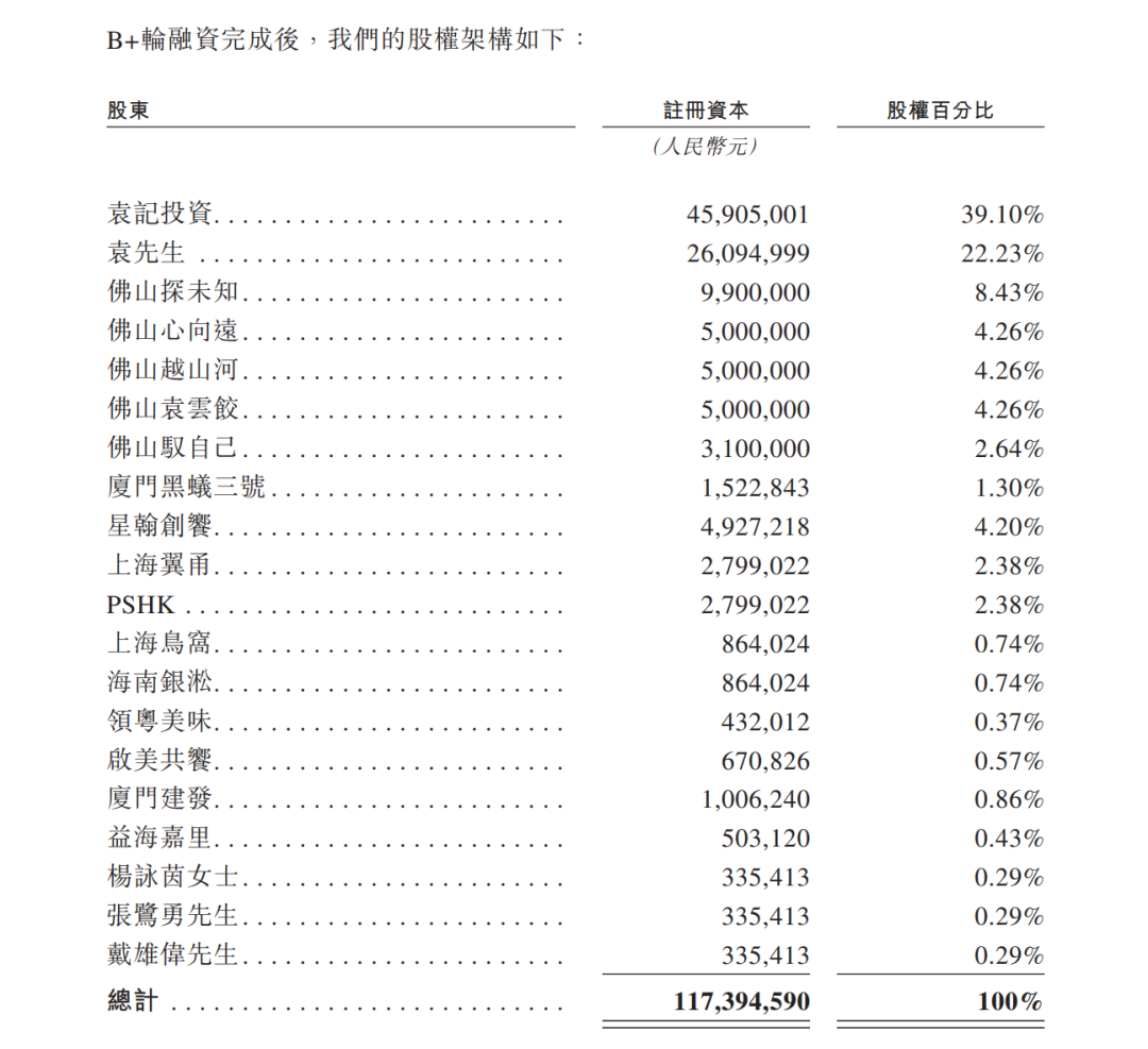在递交上市前,袁记食品已完成三轮融资,投资方包括专注消费行业的黑蚁资本、启承资本,以及产业背景深厚的厦门建发、益海嘉里等公司。其中黑蚁资本持股3.68%,益海嘉里持股0.43%。
