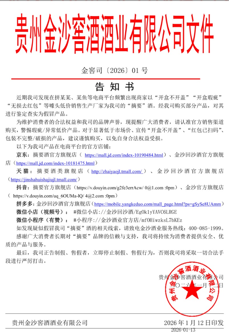 上证报中国证券网讯1月13日,金沙酒业发布告知书,近期公司发现在拼某某、某鱼等电商平台频繁出现商家以“开盒不开盖”“开盒瑕疵”“无损去红包”等噱头低价销售生产厂家为公司的“摘要”酒。