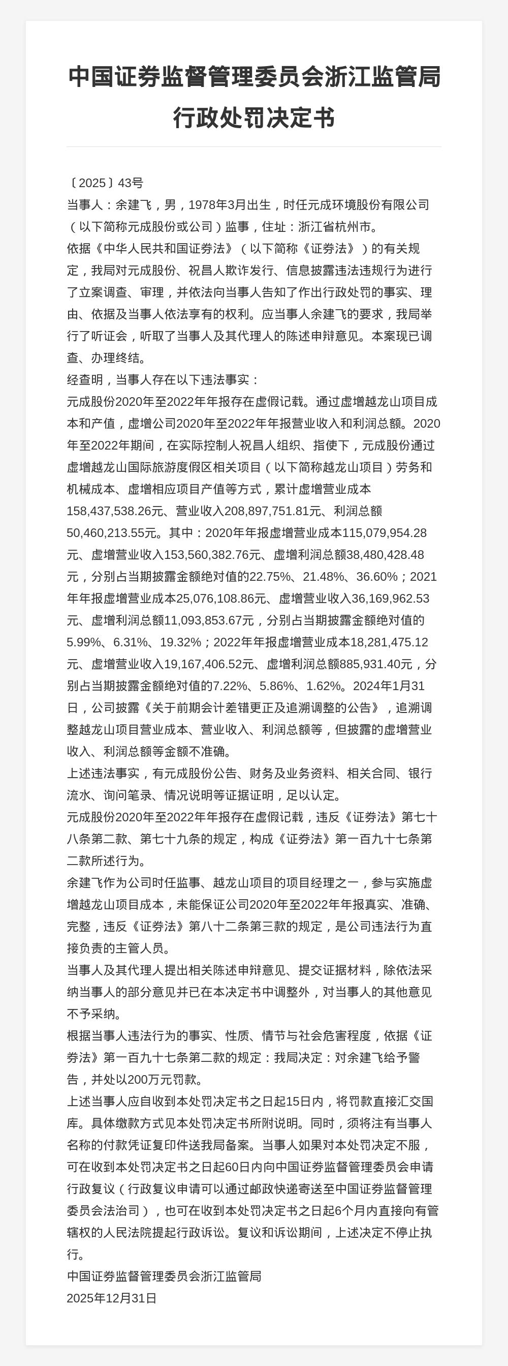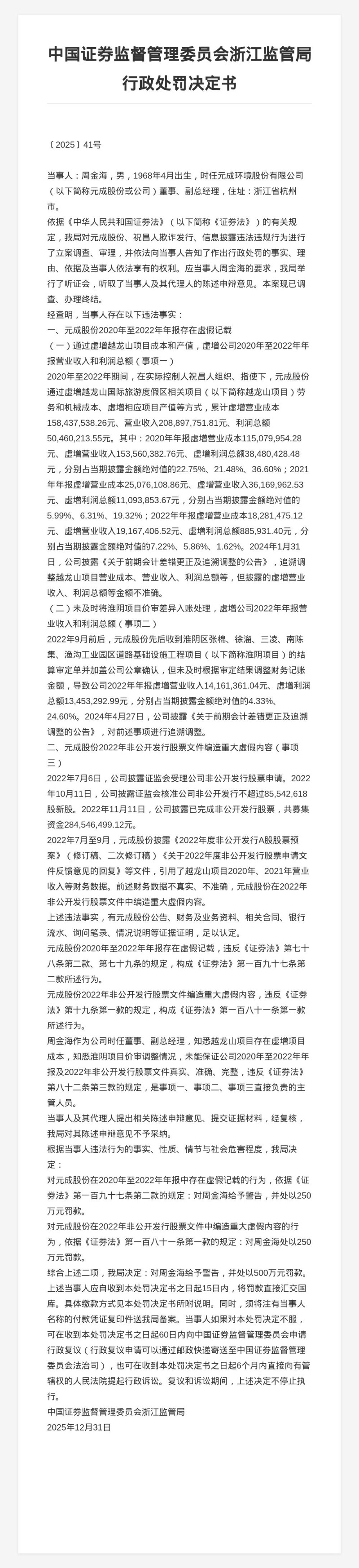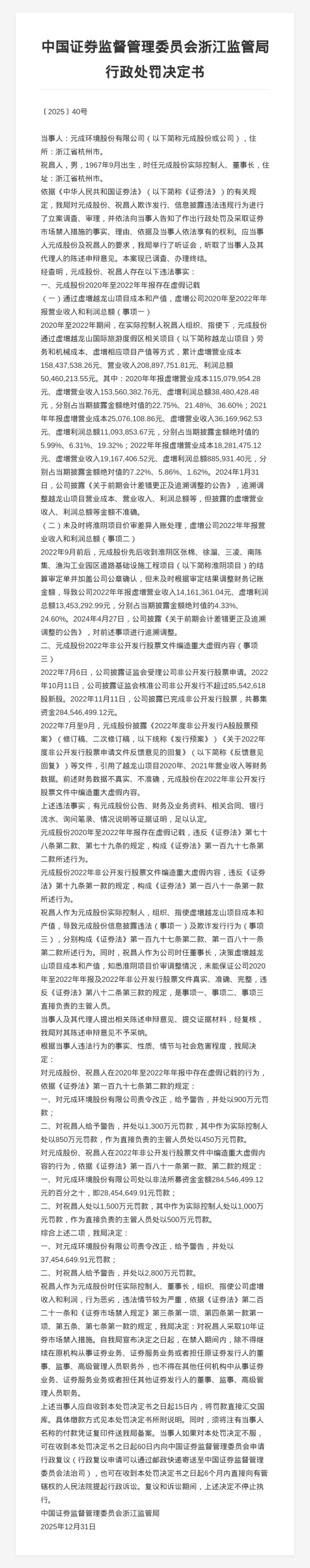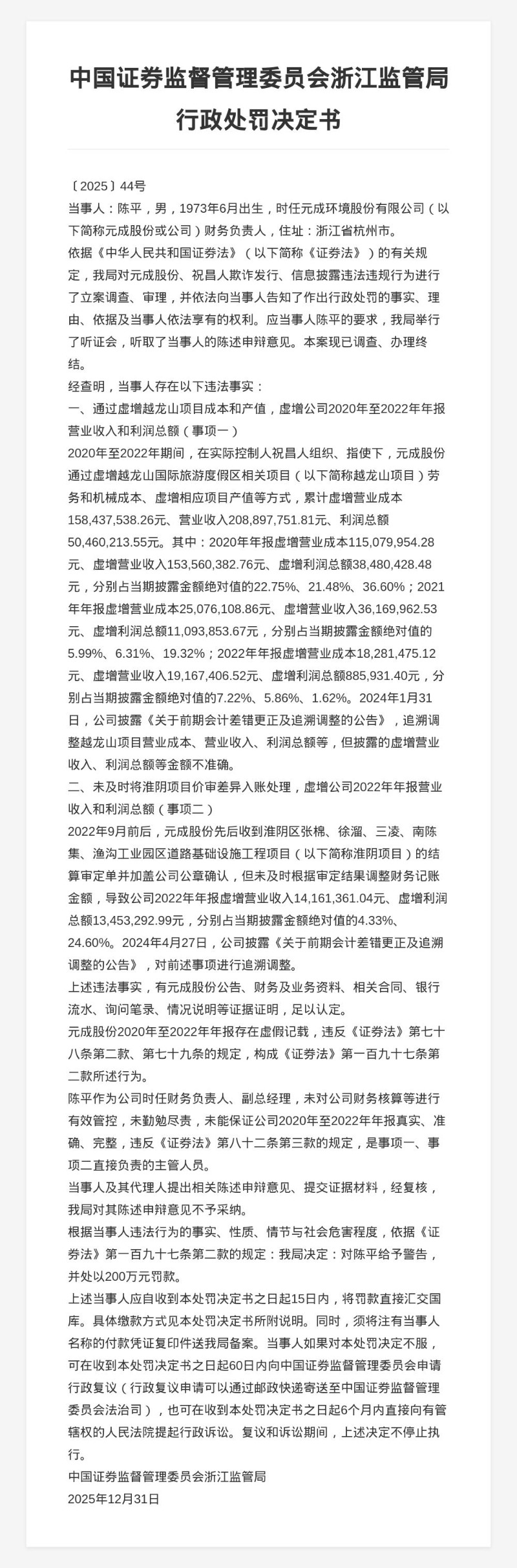 元成环境股份被罚3745.46万,责任人共被罚4200万,涉年报虚假记载等