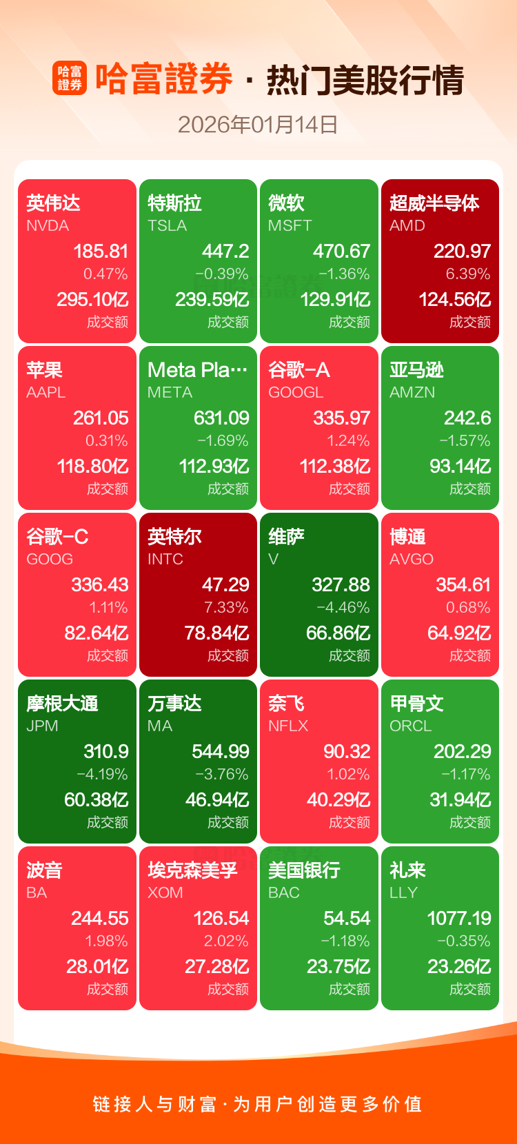 英伟达涨0.47%,特斯拉跌0.39%,微软跌1.36%,超威半导体涨6.39%,苹果涨0.31%,Meta Platforms Inc-A跌1.69%,谷歌-A涨1.24%,亚马逊跌1.57%,谷歌-C涨1.11%,英特尔涨7.33%。