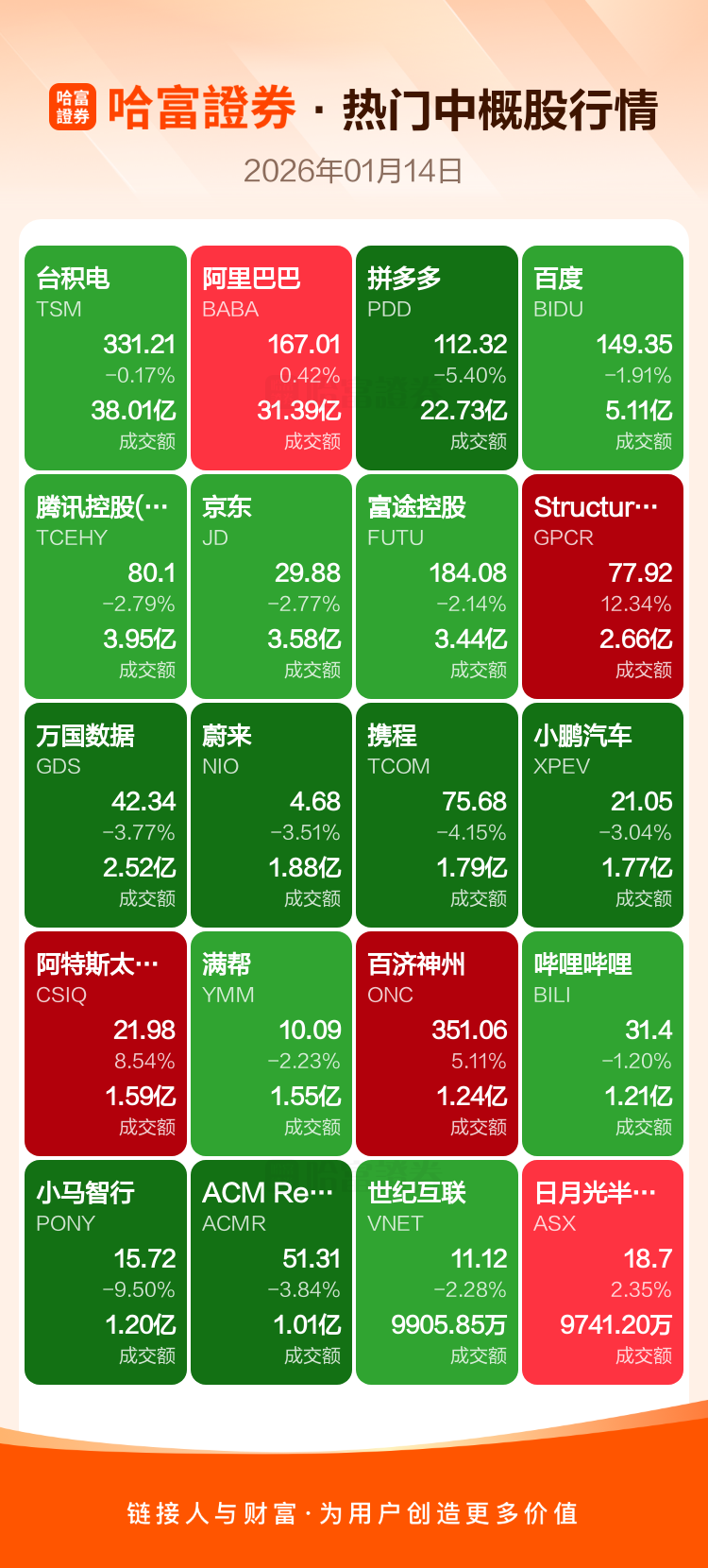 台积电跌0.17%,阿里巴巴涨0.42%,拼多多跌5.40%,百度跌1.91%,腾讯控股(ADR)跌2.79%,京东跌2.77%,富途控股跌2.14%,Structure Therapeutics Inc ADR涨12.34%,万国数据跌3.77%,蔚来跌3.51%。