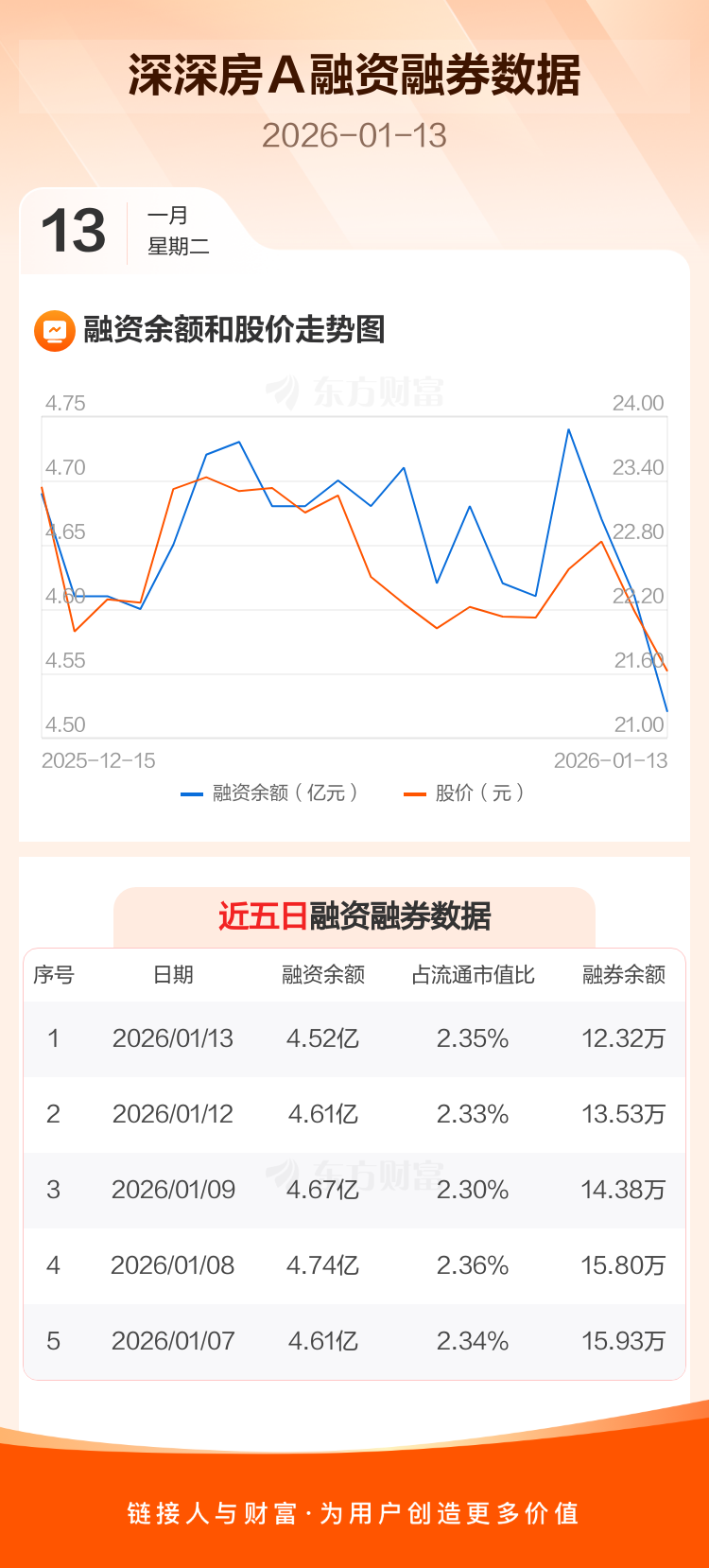 交易所最新数据显示,深深房A于2026年1月13日获融资买入1353.00万元,融资偿还2197.69万元,当日融资净偿还844.69万元。目前,该股融资余额4.52亿,占流通市值比例为2.35%。