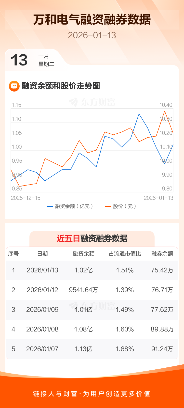 交易所最新数据显示,万和电气于2026年1月13日获融资买入1740.06万元,融资偿还1098.72万元,当日融资净买入641.34万元。目前,该股融资余额1.02亿,占流通市值比例为1.51%。