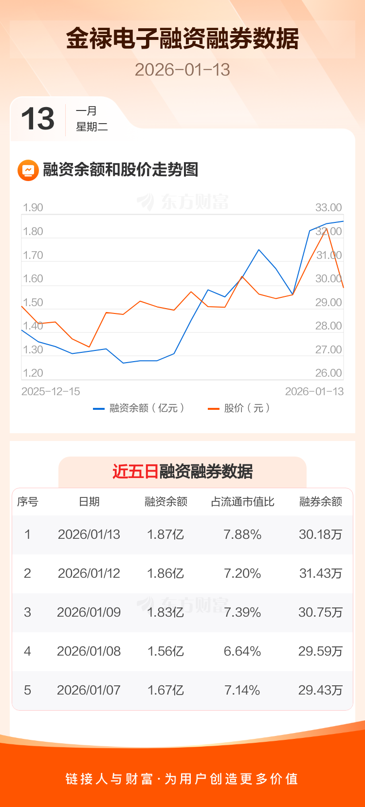 交易所最新数据显示,金禄电子于2026年1月13日获融资买入4858.59万元,融资偿还4689.62万元,当日融资净买入168.97万元。目前,该股融资余额1.87亿,占流通市值比例为7.88%。