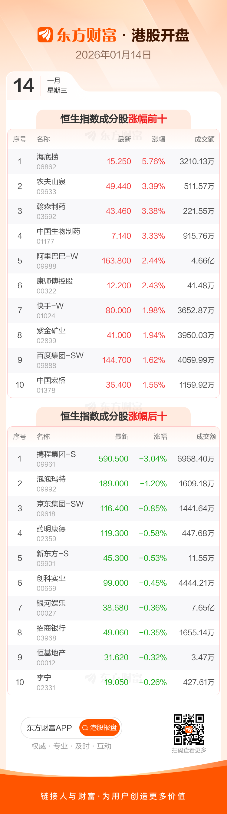 港股1月14日高开,恒生指数开盘报26971.97点,涨123.5点,涨幅0.46%;恒生科技指数开盘报5894.63点,涨24.84点,涨幅0.42%。恒生指数成分股中海底捞、农夫山泉、翰森制药涨幅居前,携程集团-S、泡泡玛特、京东集团-SW跌幅靠前。恒生科技指数成分股中阿里巴巴-W、快手-W、百度集团-SW涨幅居前,携程集团-S、蔚来-SW、零跑汽车跌幅靠前。