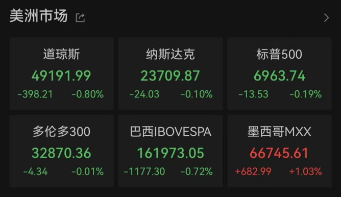 当地时间1月13日,美三大股指全线收跌。截至收盘,道指跌0.80%,报49191.99点;纳指跌0.10%,报23709.87点;标普500指数跌0.19%,报6963.71点。