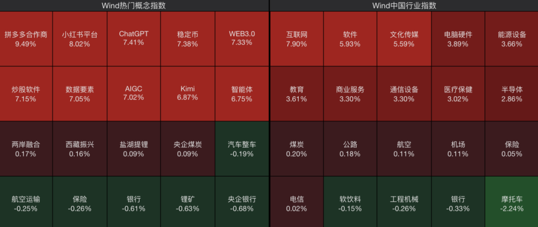 从板块来看,AI应用方向领涨市场,互联网、软件、文化传媒等板块涨幅居前,多元金融、半导体、AI医疗等板块表现活跃;保险、锂矿、银行等板块震荡调整。