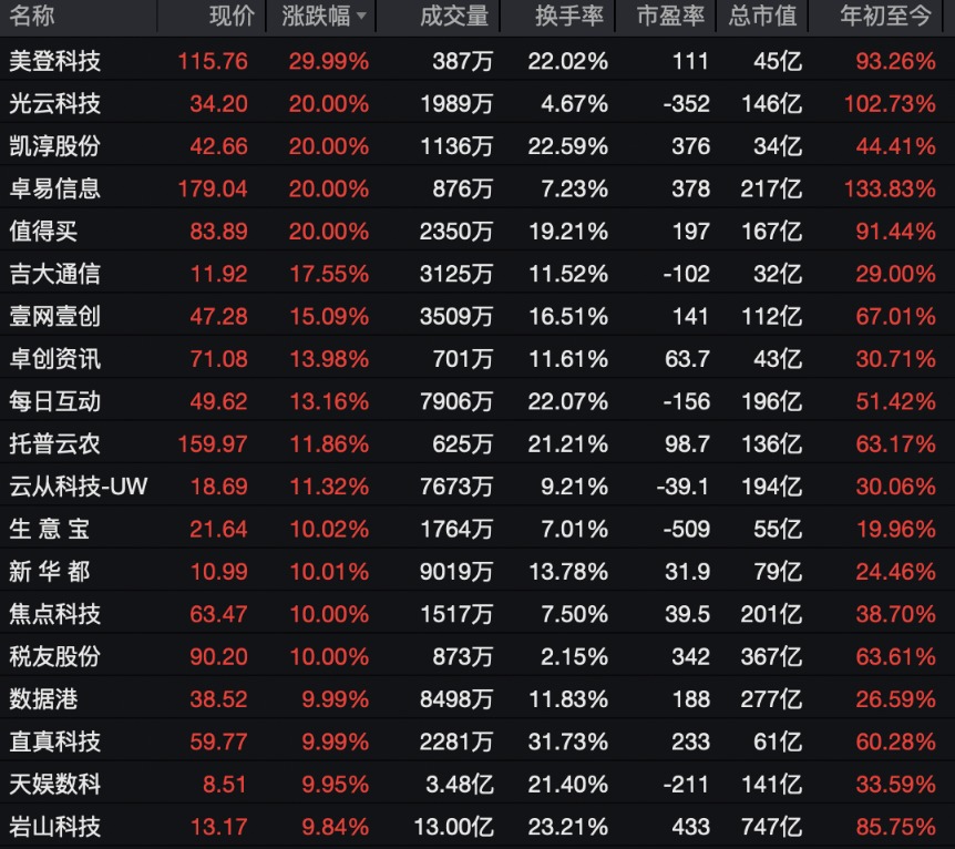 AI应用方向领涨市场,互联网概念股强势走高,美登科技30%涨停,光云科技、凯淳股份、卓易信息、值得买等多股实现20%涨停。