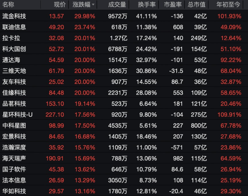 此外,软件板块狂掀涨停潮,流金科技30%涨停,科大国创、通达海、三维天地等多股实现20%涨停,金桥信息、格尔软件、云鼎科技等多股涨停。