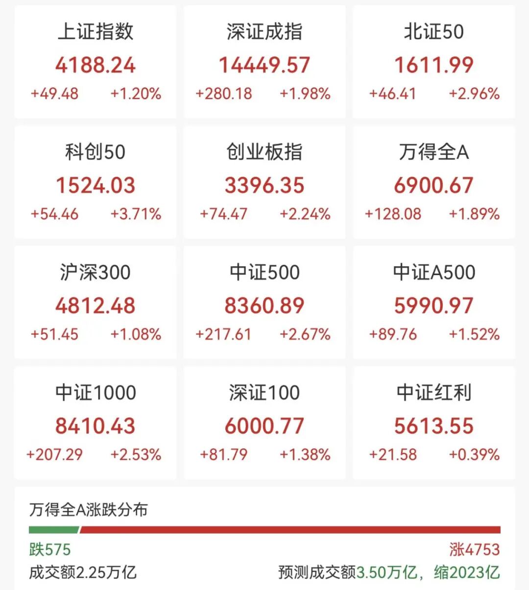 1月14日上午,A股市场持续走高,创业板指拉升涨逾2%。截至午间收盘,沪指涨1.2%,深成指涨1.98%,创业板指涨2.24%。全市场超4700只个股上涨,超百股涨停。