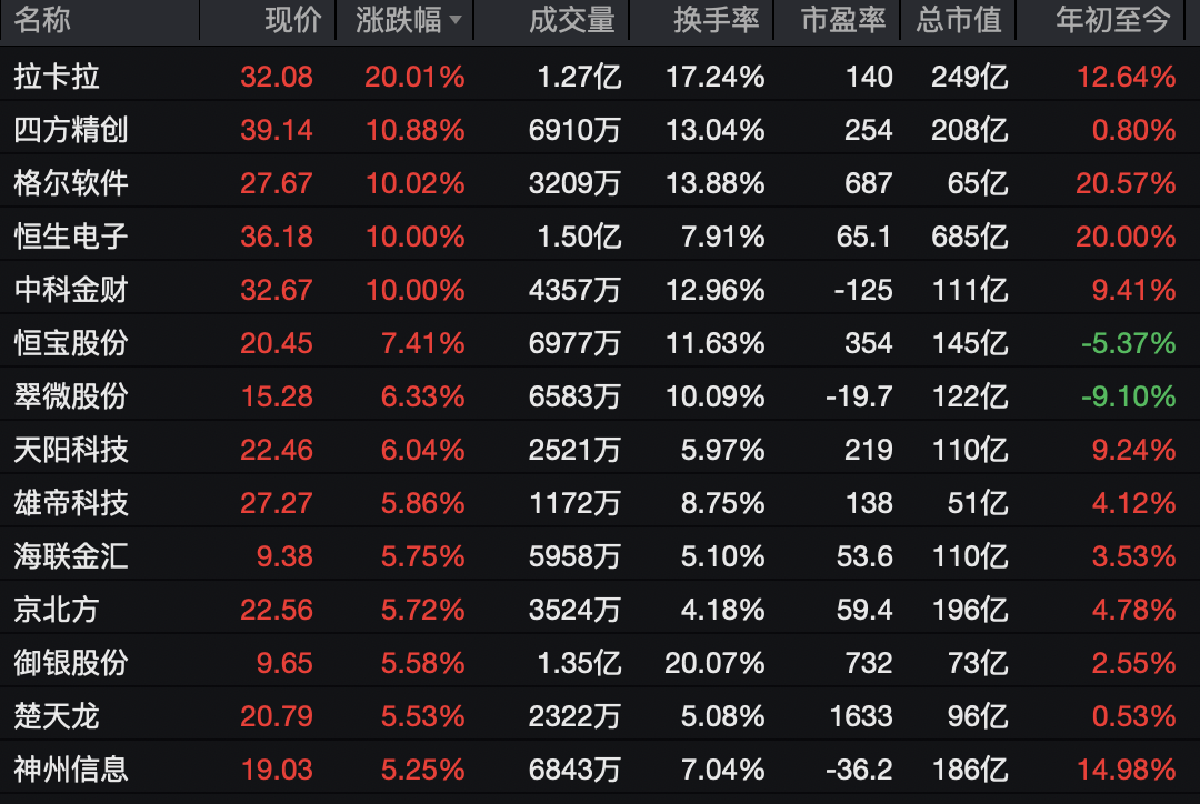 多元金融板块持续走高,拉卡拉20%涨停,同花顺一度涨超10%,创历史新高,中科金财、恒生电子等涨停。