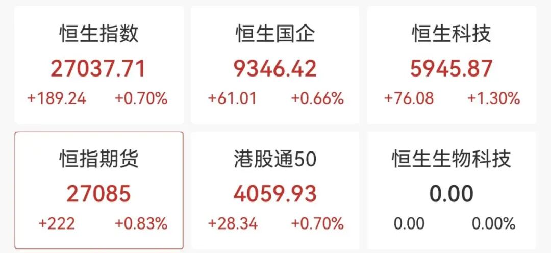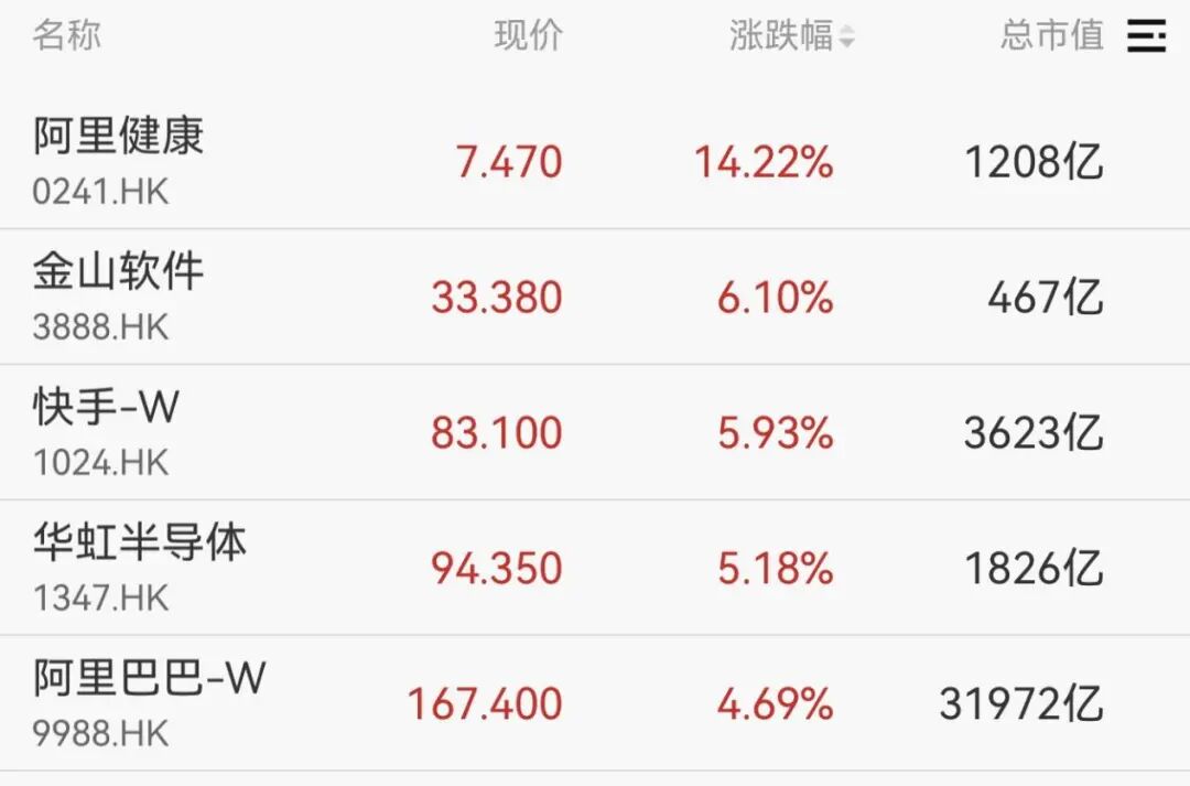 港股方面,恒生科技指数涨超1%,阿里健康涨超14%,金山软件、快手、华虹半导体等均涨超5%。