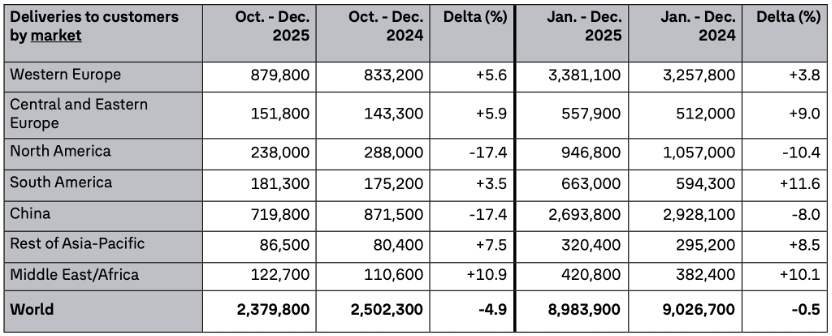 具体来看,欧洲、南美及新兴市场表现较为亮眼。西欧市场2025年第四季度交付87.98万辆,同比增长5.6%;全年交付338.11万辆,同比增长3.8%。中东欧市场2025年第四季度交付15.18万辆,同比增长5.9%;全年交付55.79万辆,较同比增长9%。