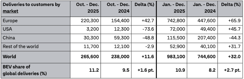 在欧洲市场,电动车型表现最为亮眼,2025年第四季度交付22.03万辆,同比激增42.7%;全年交付74.28万辆,增幅高达65.9%,成为集团增长的核心驱动力。