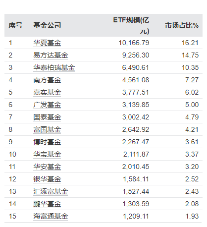 数据显示,除华夏基金外,ETF管理规模前十五的公司规模均破千亿元。具体来看,易方达基金旗下ETF规模排在第二,达到9256.3亿元;华泰柏瑞基金旗下ETF规模排在第三,达到6490.61亿元。南方、嘉实、广发、国泰基金旗下ETF管理规模均超过3000亿元。富国、博时、华宝、华安基金旗下ETF管理规模均超过2000亿元。银华、汇添富、鹏华、海富通基金旗下ETF管理规模均在千亿元之上。此外,ETF管理规模排名第十六的天弘基金也突破千亿元。
