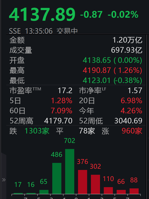 央广网北京1月14日消息14日,沪指午后快速回落,盘中一度跳水翻绿下跌0.38%。此前一度涨超1%。截至13点35分,沪指下跌0.02%,报4137.89点。