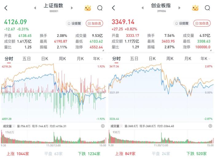 至收盘,上证综指跌0.31%,报4126.09点;科创50指数涨2.13%,报1500.91点;深证成指涨0.56%,报14248.6点;创业板指涨0.82%,报3349.14点。