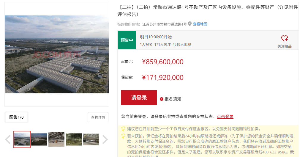 【大河财立方消息】1月14日,京东资产交易平台披露的信息显示,常熟市通达路1号不动产及厂区内设备设施、零配件等财产二次拍卖,起拍价约8.60亿元,资产评估价约15.35亿元,拍卖时间为1月15日上午10时,此次由江苏省常熟市人民法院进行拍卖。