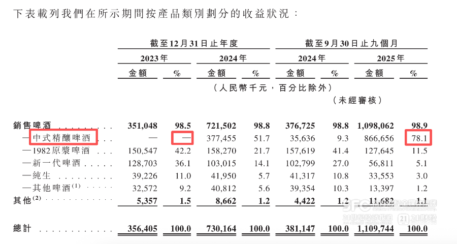 招股资料显示,2025年前三季度,金星啤酒78.1%的收入都是“中式精酿啤酒”贡献的。而2023年的时候这一品类的收入贡献还是0。受其带动,2024年金星啤酒的整体收入比2023年翻了一倍,2025年前三季度整体收入是前一年同期的三倍还多。