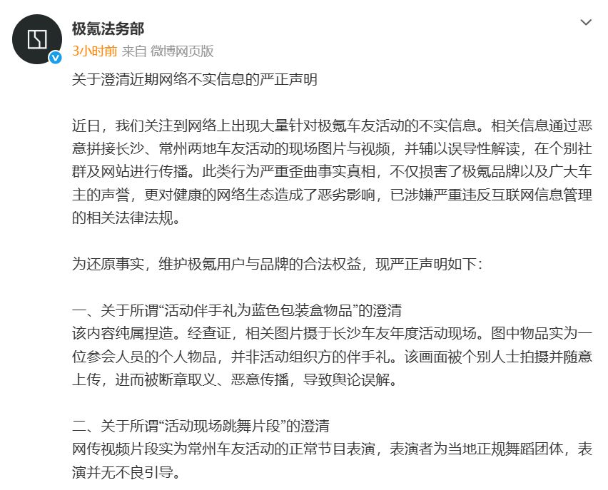 为还原事实,维护极氪用户与品牌的合法权益,现严正声明如下: