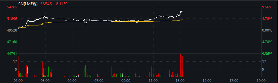 锡价的表现更为“惊艳”。1月14日亚太交易时段,LME锡突破54000美元,盘中一度暴涨10%,最高触及54500美元/吨,创下历史新高,年初至今涨幅已接近34%;国内市场上,上期所锡期货主力合约当日触及涨停,夜盘继续上涨,同样一度暴涨逾10%,截至发稿在435000元/吨上方浮动。