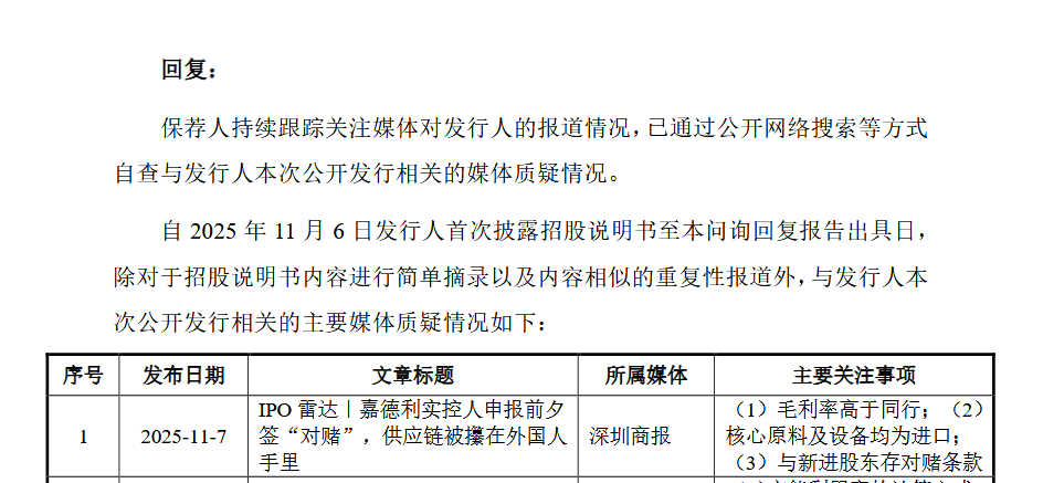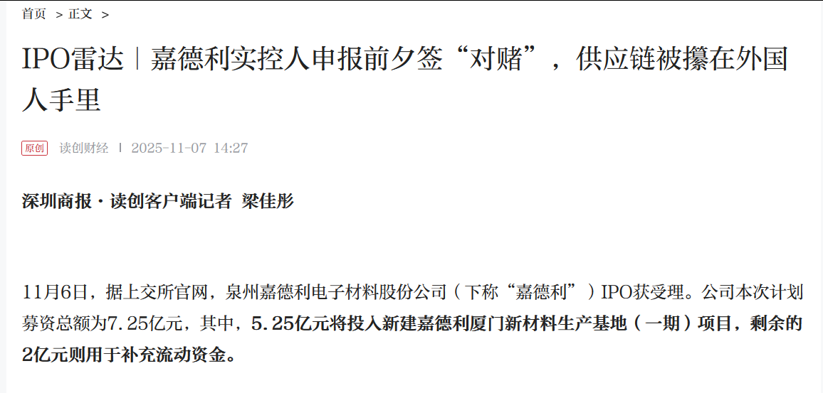 1月14日,泉州嘉德利电子材料股份公司(简称"嘉德利")披露了上交所主板IPO首轮审核问询回复,直面监管层的13项质疑。其中,还回应了深圳商报读创客户端2025年11月7日《IPO雷达|嘉德利实控人申报前夕签“对赌”,供应链被攥在外国人手里》相关报道提出的质疑。