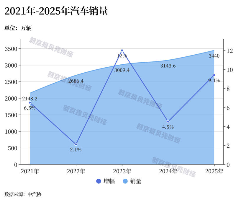 中汽协数据显示,2025年汽车产销量分别为3453.1万辆和3440万辆,同比分别增长10.4%和9.4%。其中,作为汽车消费的核心组成部分,乘用车产销规模首次超过3000万辆,分别达到3027万辆和3010.3万辆,同比分别增长10.2%和9.2%。