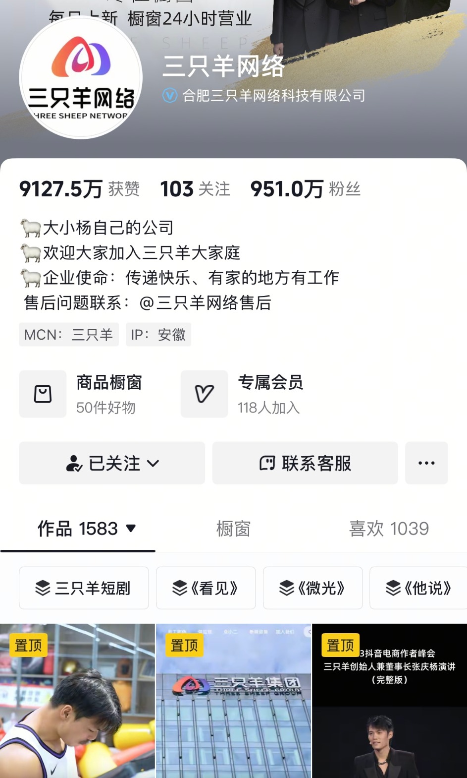 “疯狂小杨哥”是抖音首位粉丝破亿的账号,这一超级IP的陨落必然对三只羊的客群有较大的影响。目前,三只羊旗下主播粉丝量在100多万到1000多万不等,而官方“三只羊网络”的账号也不足1000万。