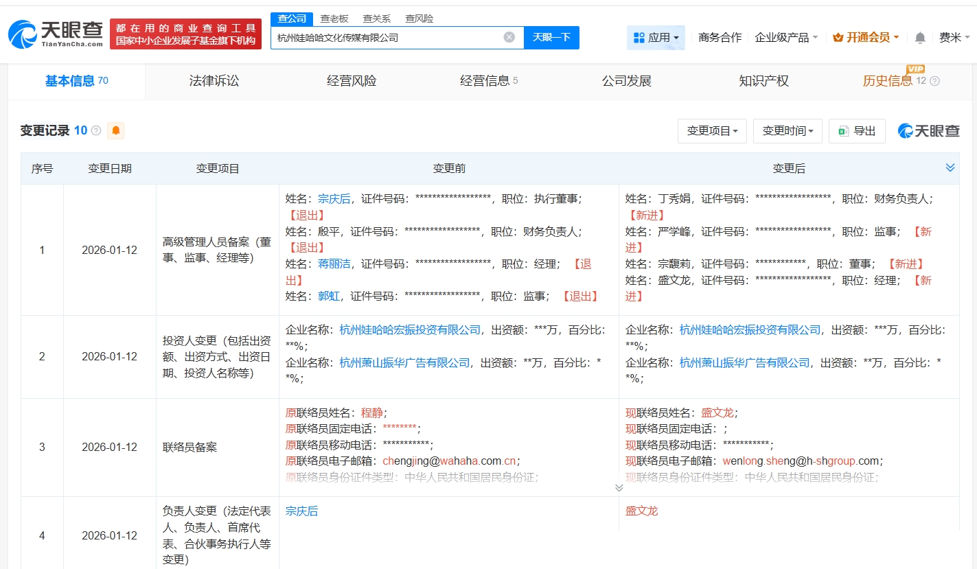 每经AI快讯,天眼查工商信息显示,近日,杭州娃哈哈文化传媒有限公司发生工商变更,宗庆后卸任法定代表人、执行董事,盛文龙接任法定代表人并担任经理,宗馥莉担任董事,严学峰担任监事,同时部分主要人员发生变更。杭州娃哈哈文化传媒有限公司成立于2015年8月,注册资本500万元人民币,经营范围包括组织文化艺术交流活动、文化娱乐经纪人服务、项目策划与公关服务等。股东信息显示,该公司由杭州宏振投资有限公司、杭州萧山振华广告有限公司共同持股。