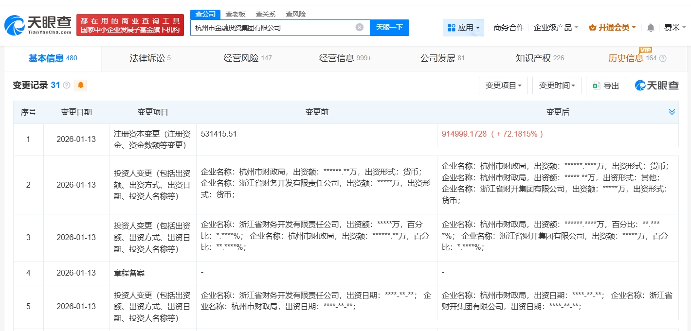 杭州市金融投资集团增资至91.5亿 增幅约72%